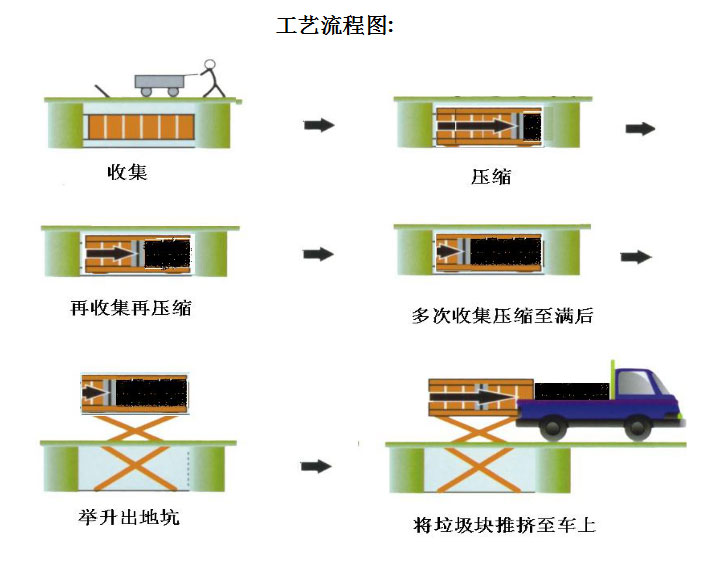 1.主要特點(diǎn) ◇平穩(wěn)可靠:兩側(cè)舉升,剪叉跨度大,升降平穩(wěn),無傾斜; ◇淺地坑:地坑深度僅為1.55m,保潔及維修極為方便; ◇高效率:壓實(shí)每噸垃圾時(shí)間≤10min; ◇全封閉水平壓縮:采用水平壓縮方式,垃圾壓縮密度≥0.86t/m3,垃圾壓縮后體積大大減小,從而大幅度提高轉(zhuǎn)運(yùn)車輛裝載量和轉(zhuǎn)運(yùn)效率,降低垃圾處理、轉(zhuǎn)運(yùn)等費(fèi)用; ◇動(dòng)作少,故障率低,整套設(shè)備的垃圾壓縮、裝車由三個(gè)動(dòng)作完成,簡單實(shí)用,各動(dòng)作之間安全互鎖,防止操作人員誤操作造成安全事故,安全可靠; ◇垃圾儲存、壓縮及寄存全部在地面以下,地面上沒有垃圾散落,對環(huán)境影響較小,環(huán)保性好;垃圾壓縮后密度高,水份少,可避免汽車運(yùn)輸中的垃圾散落、污水滴漏現(xiàn)象,避免二次污染; ◇土建費(fèi)用低,占地面積小,可以不蓋大型工作間,既節(jié)約了投資,也縮短了工期; ◇留有專門的維修窗口,維修保養(yǎng)方便; ◇設(shè)有固定式操作和遙控器兩種操作模式,方便實(shí)用; ◇自動(dòng)化程度高,可大幅提高工作效率,降低勞動(dòng)強(qiáng)度。